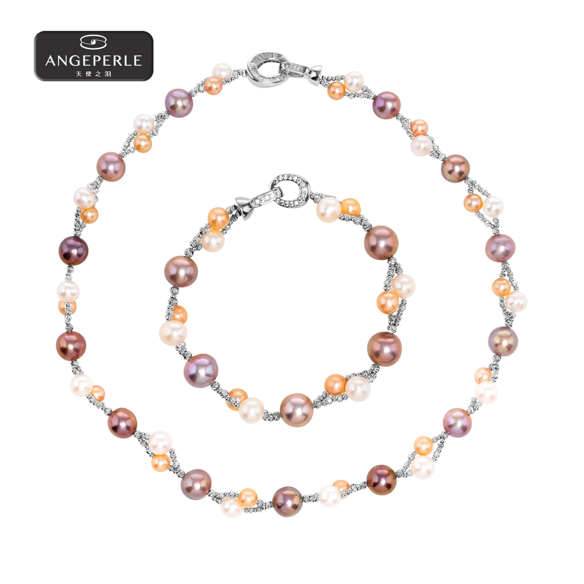 ANGELPERLE Alloy Freshwater Pearl Edison Three-Flower Lane Necklace & Bracelet Set (2pcs)(TSAW128)