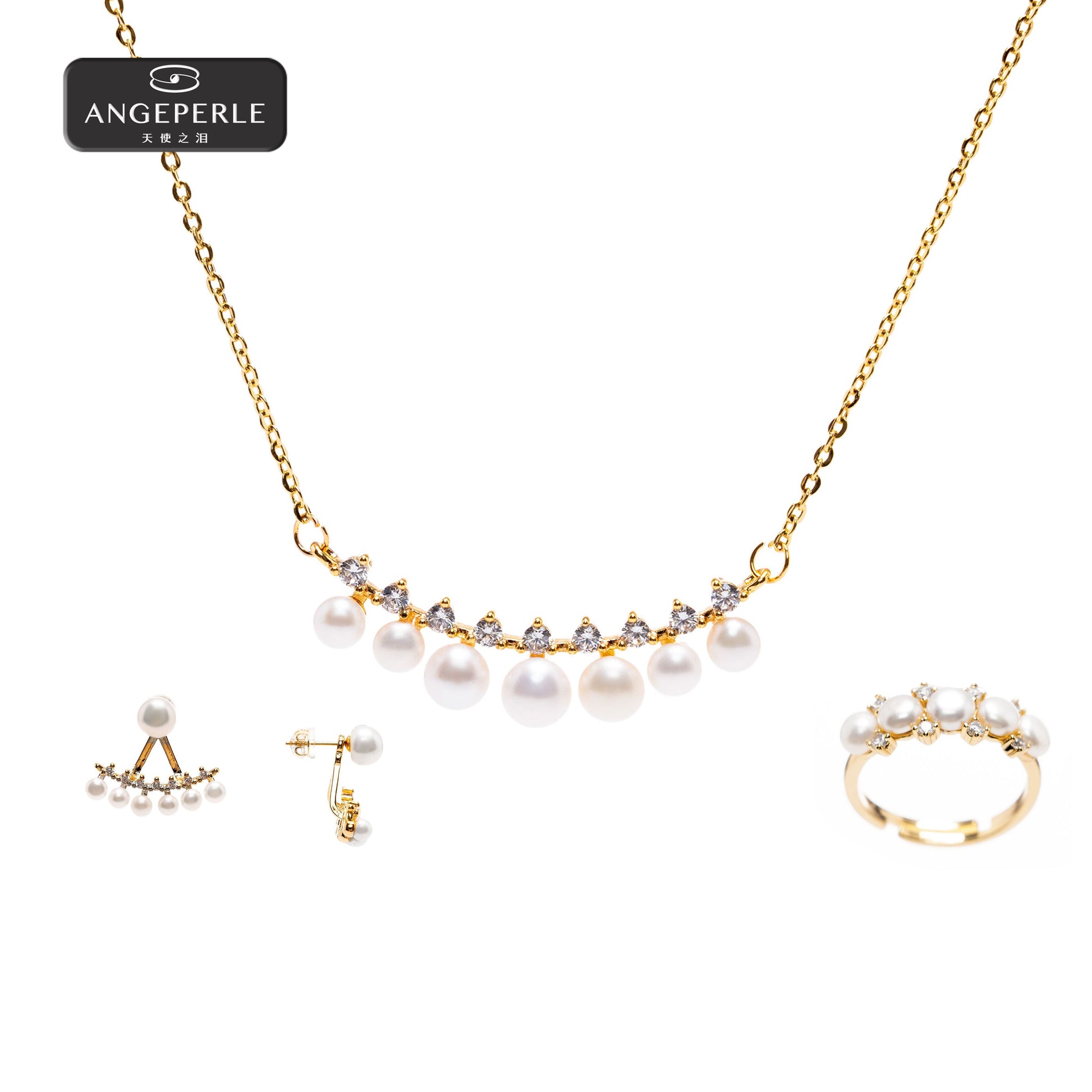 ANGELPERLE Alloy Freshwater Pearl Smile Chain Earrings & Ring 3-Piece Set (TSSL131)